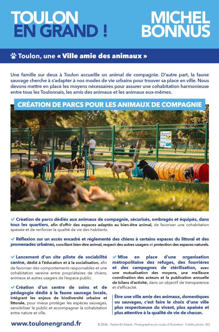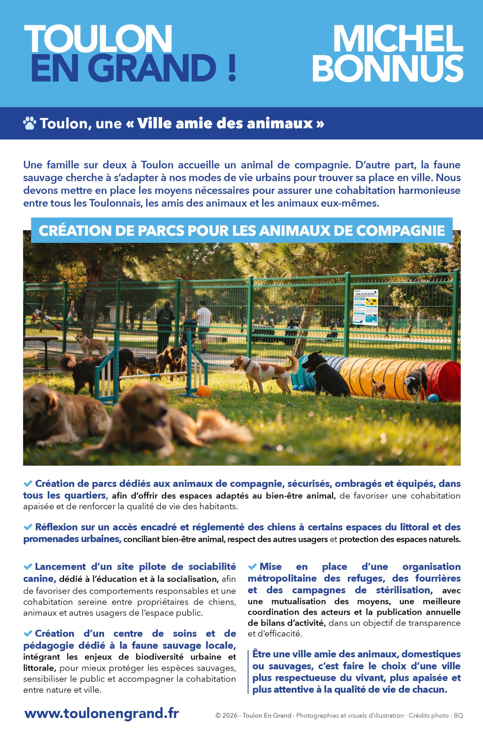Une famille sur deux à Toulon accueille un animal de compagnie. D’autre part, la faune sauvage cherche à s’adapter à nos modes de vie urbains pour trouver sa place en ville. Nous devons mettre en place les moyens nécessaires pour assurer une cohabitation harmonieuse entre tous les Toulonnais, les amis des animaux et les animaux eux-mêmes.