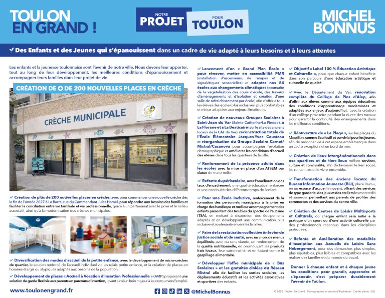 Donner à chaque enfant et à chaque jeune les conditions pour grandir, apprendre et s’épanouir, c’est préparer durablement l’avenir de Toulon.
