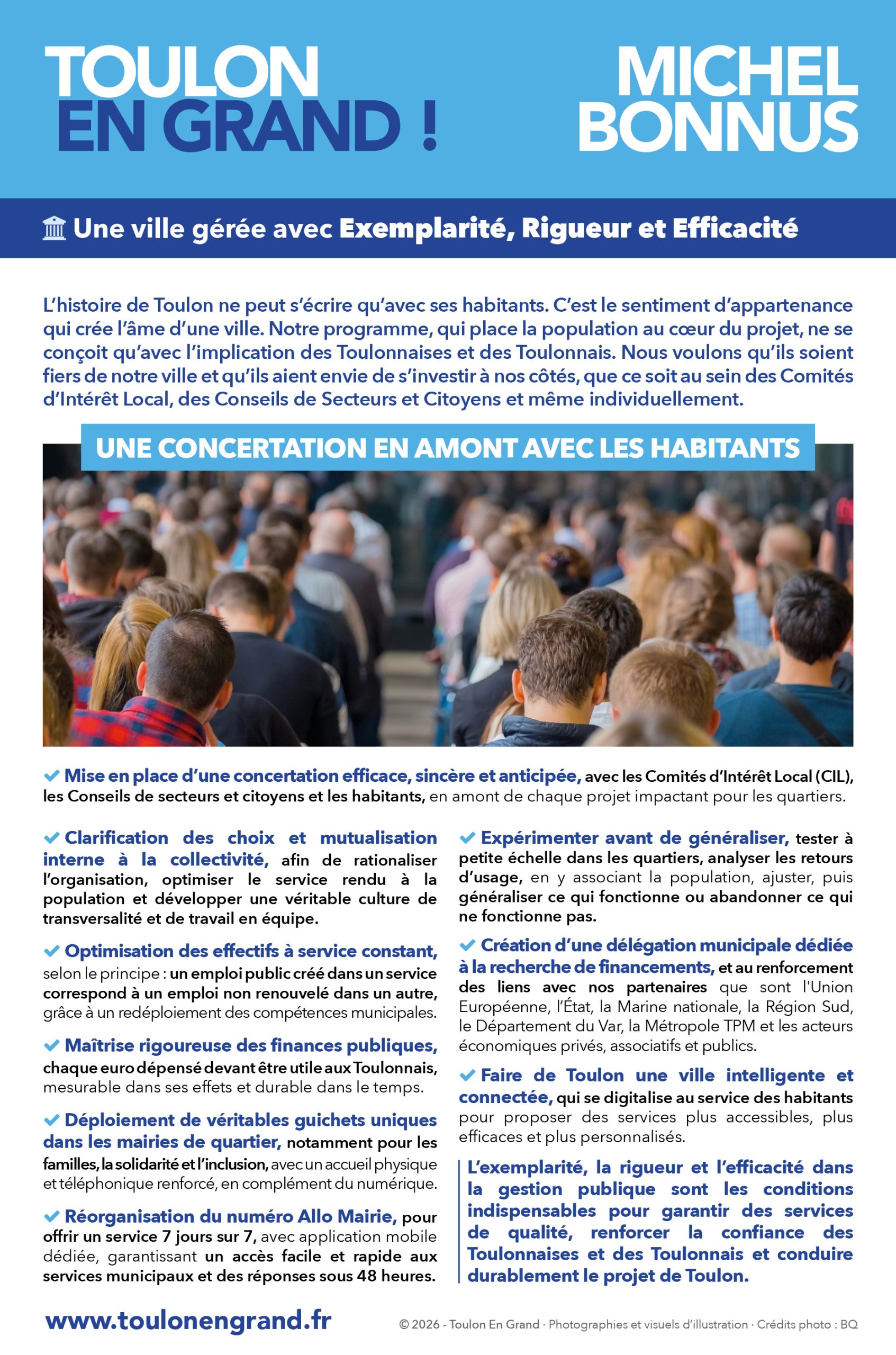 L’exemplarité, la rigueur et l’efficacité dans la gestion publique sont les conditions indispensables pour garantir des services de qualité, renforcer la confiance des Toulonnaises et des Toulonnais et conduire durablement le projet de Toulon.