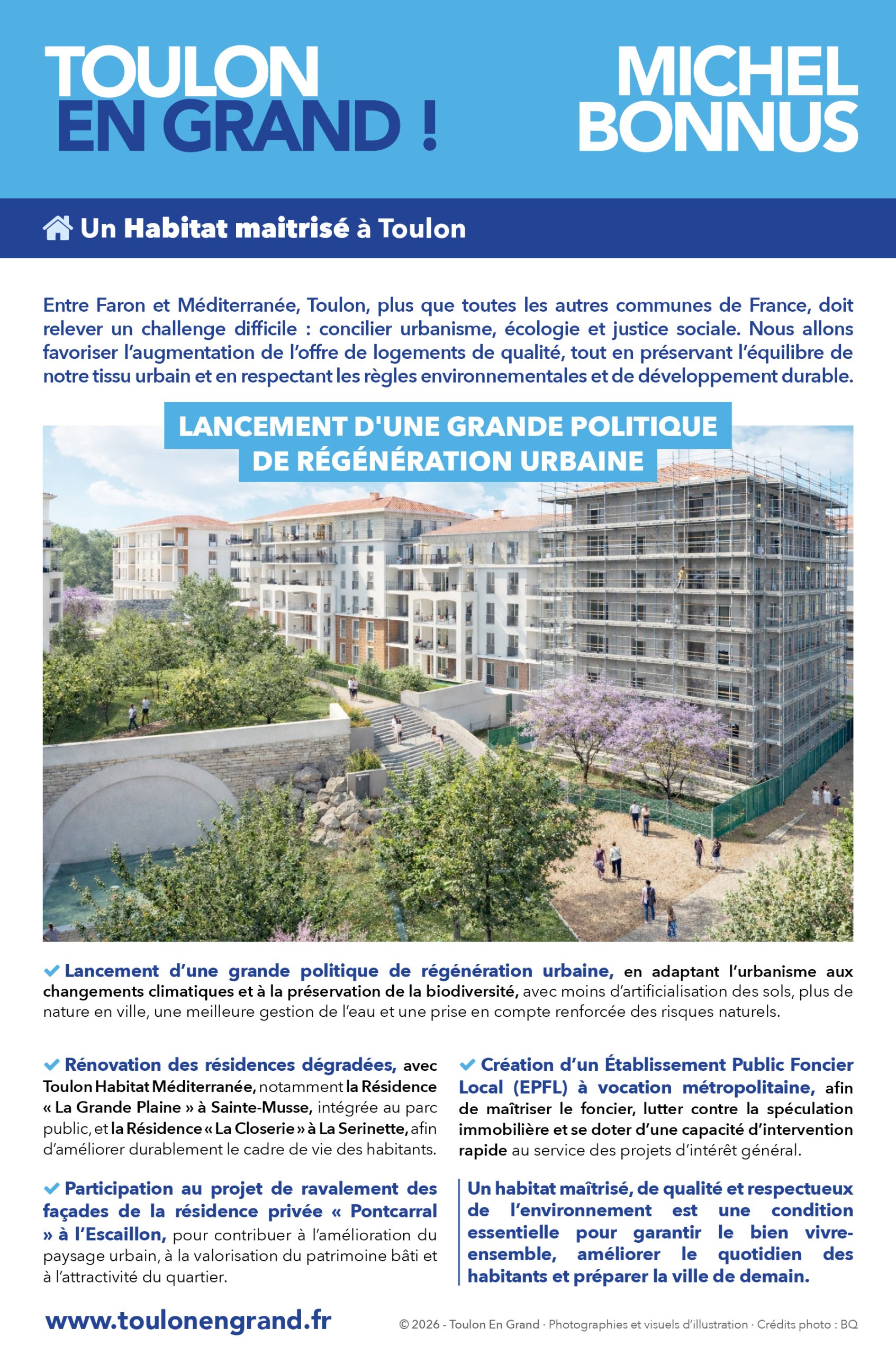 Entre Faron et Méditerranée, Toulon, plus que toutes les autres communes de France, doit relever un challenge difficile : concilier urbanisme, écologie et justice sociale. Nous allons favoriser l’augmentation de l’offre de logements de qualité, tout en préservant l’équilibre de notre tissu urbain et en respectant les règles environnementales et de développement durable.