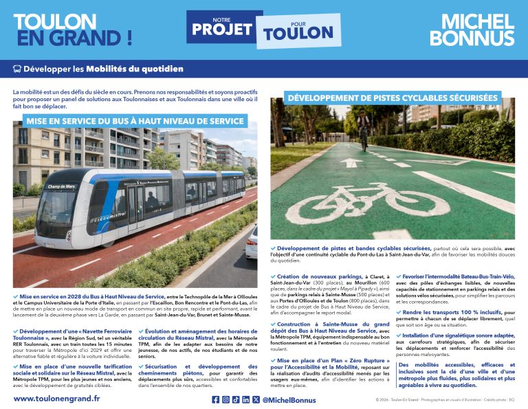 La mobilité est un des défis du siècle en cours. Prenons nos responsabilités et soyons proactifs pour proposer un panel de solutions aux Toulonnaises et aux Toulonnais dans une ville où il fait bon se déplacer.