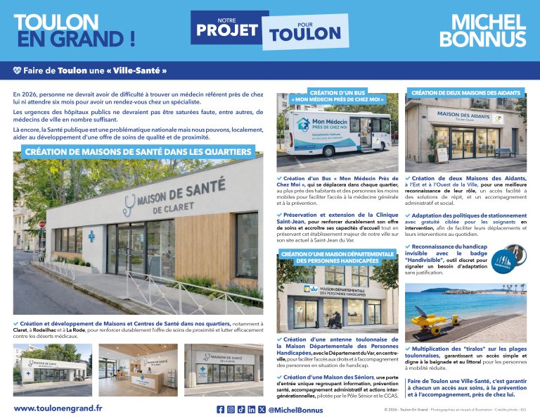 - Création d’une antenne toulonnaise de la Maison Départementale des Personnes Handicapées, avec le Département du Var, en centre-ville, pour faciliter l’accès aux droits et à l’accompagnement des personnes en situation de handicap.
