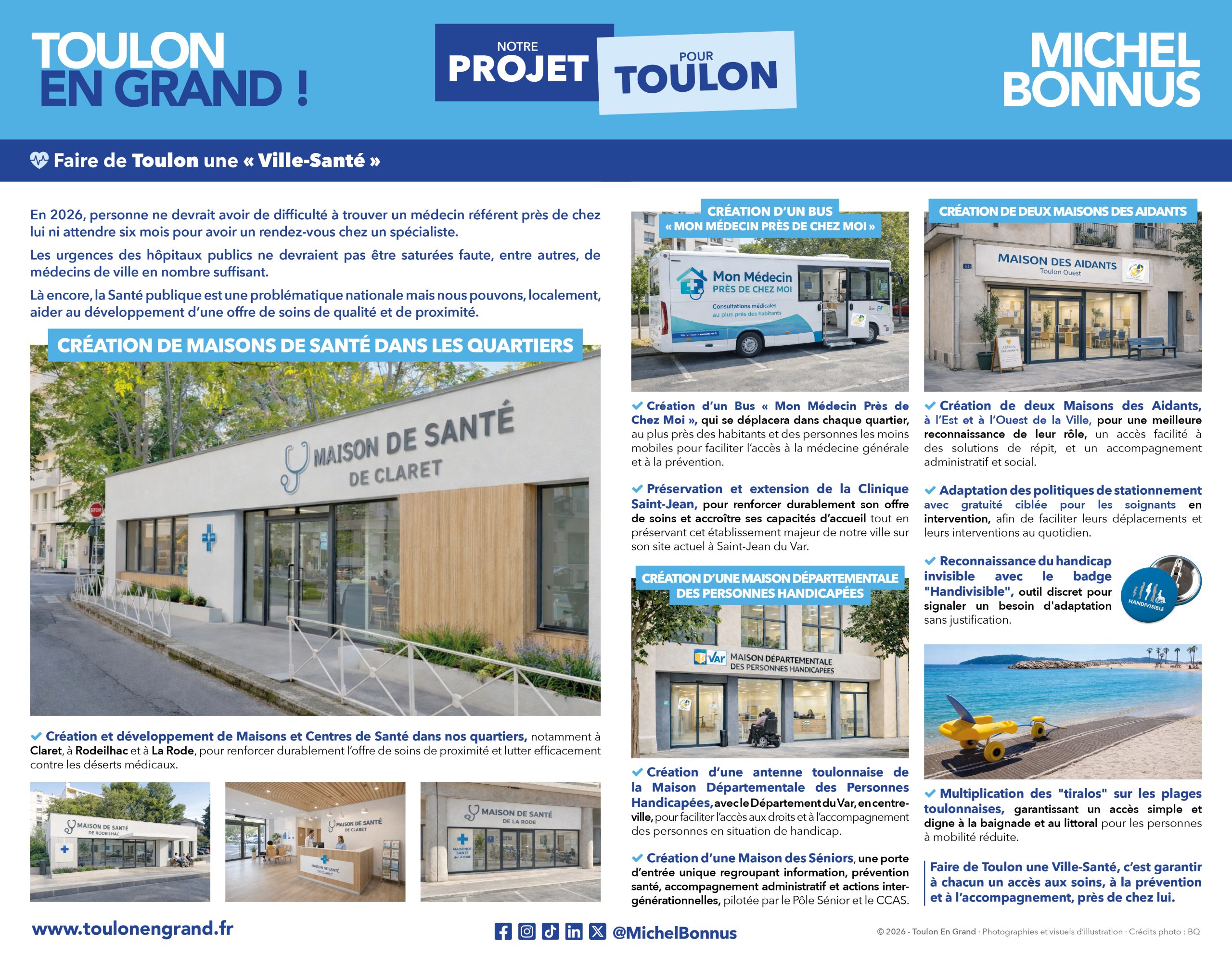 - Création et développement de Maisons et Centres de Santé dans nos quartiers, notamment à Claret, à Rodeilhac et à La Rode, pour renforcer durablement l’offre de soins de proximité et lutter efficacement contre les déserts médicaux.