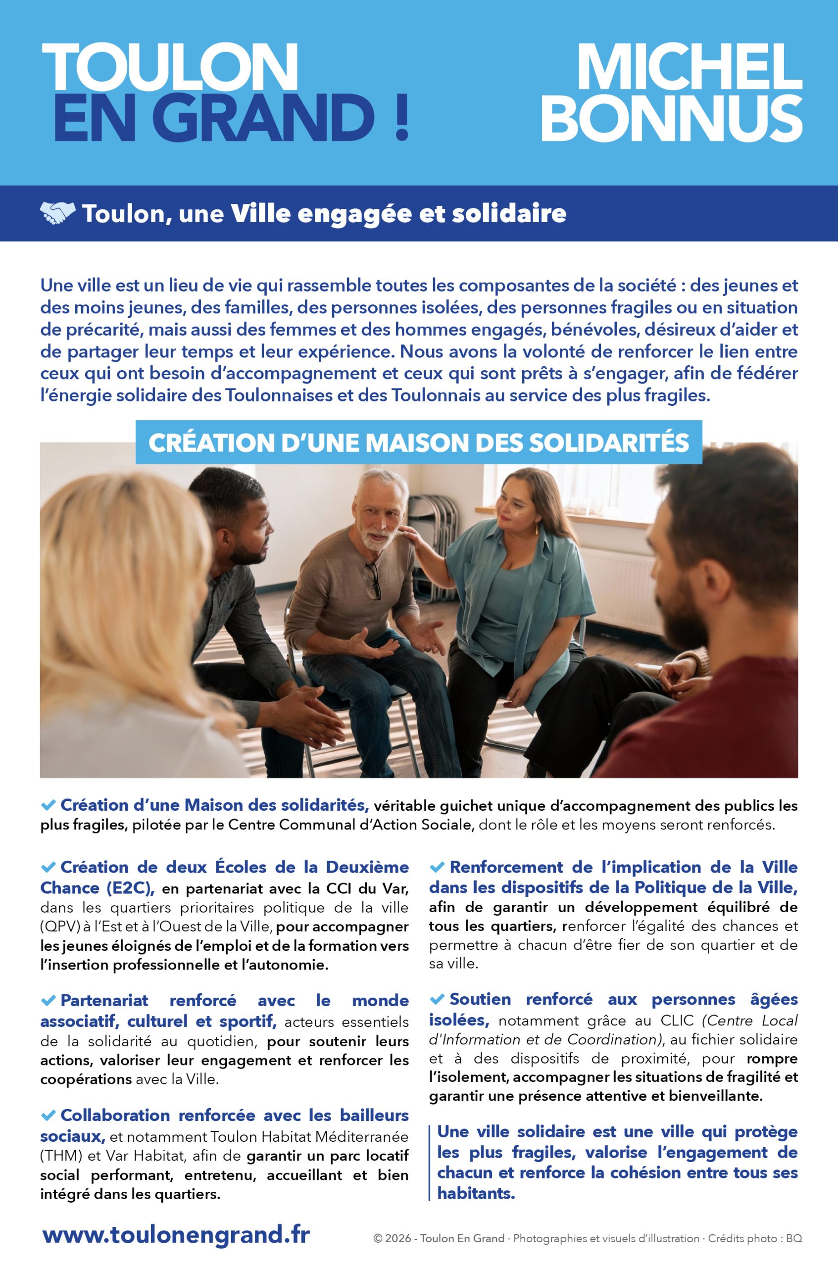 Une ville est un lieu de vie qui rassemble toutes les composantes de la société : des jeunes et des moins jeunes, des familles, des personnes isolées, des personnes fragiles ou en situation de précarité, mais aussi des femmes et des hommes engagés, bénévoles, désireux d’aider et de partager leur temps et leur expérience. Nous avons la volonté de renforcer le lien entre ceux qui ont besoin d’accompagnement et ceux qui sont prêts à s’engager, afin de fédérer l’énergie solidaire des Toulonnaises et des Toulonnais au service des plus fragiles.