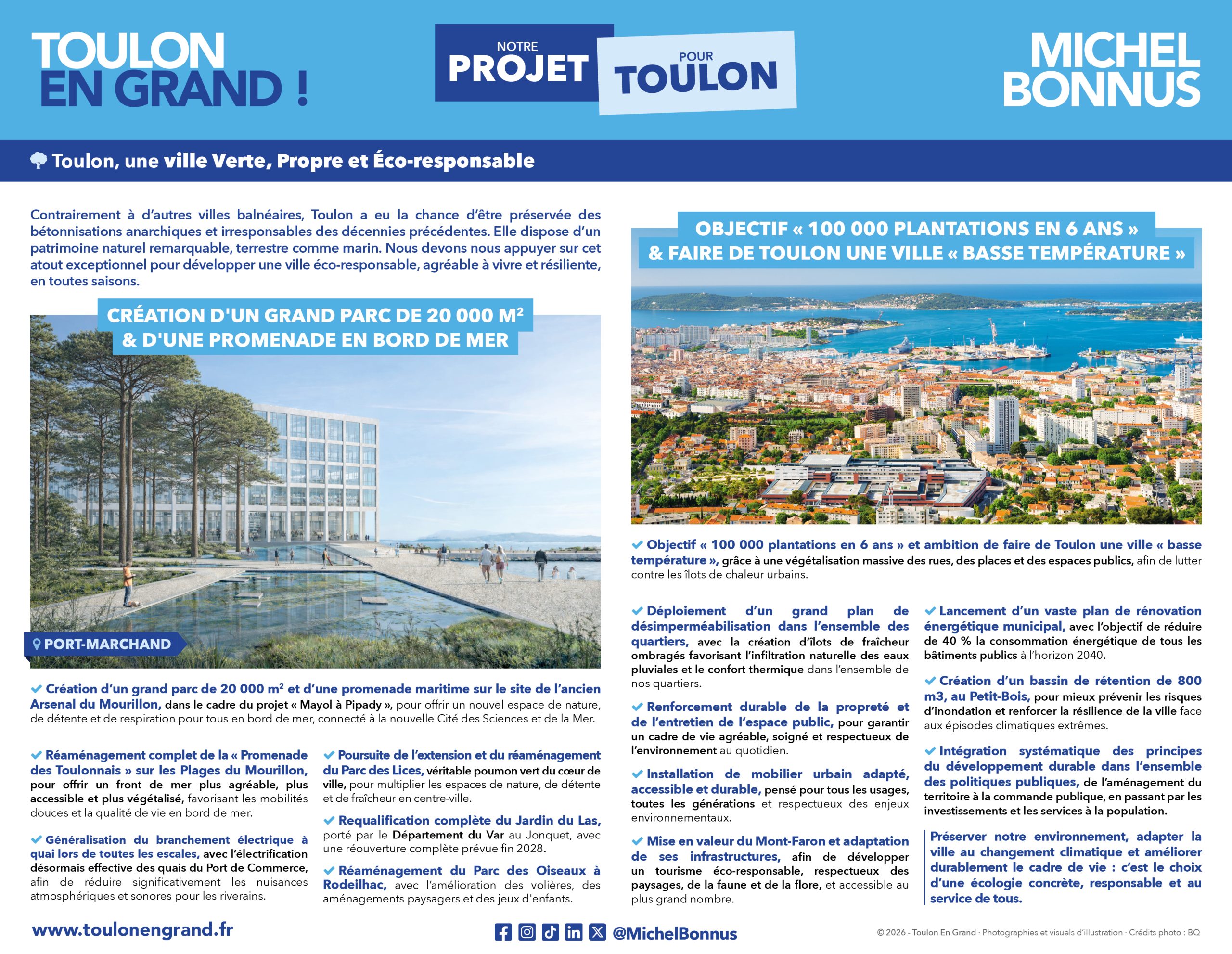 - Objectif « 100 000 plantations en 6 ans » et ambition de faire de Toulon une ville « basse température », grâce à une végétalisation massive des rues, des places et des espaces publics, afin de lutter contre les îlots de chaleur urbains.